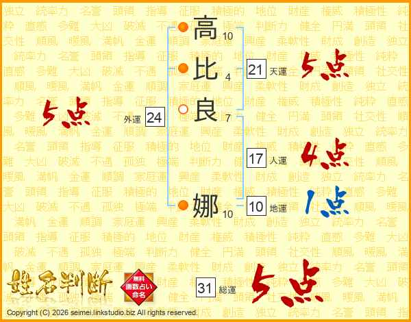 生活面を象徴する運勢です。外部から受ける影響力を表し、結婚運、家庭運や職場、環境への順応性を表します。総運から人運を引いた画数。姓や名が1文字の場合を除く。
