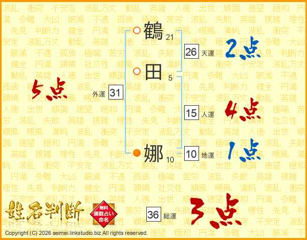 鶴(21画)田(5画) 娜(10画)