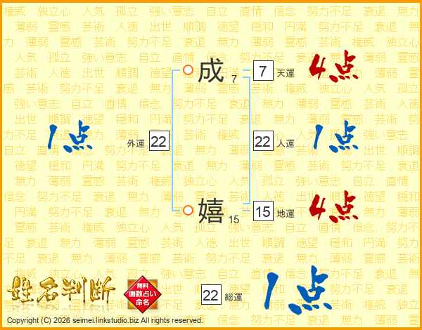 生活面を象徴する運勢です。外部から受ける影響力を表し、結婚運、家庭運や職場、環境への順応性を表します。総運から人運を引いた画数。姓や名が1文字の場合を除く。