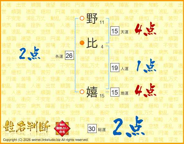 画数の奇数(○陽)と偶数(●陰)の配列で吉凶を占います。どちらかにかたよる名前は大凶名で避ける必要があります。画数の奇数偶数。
