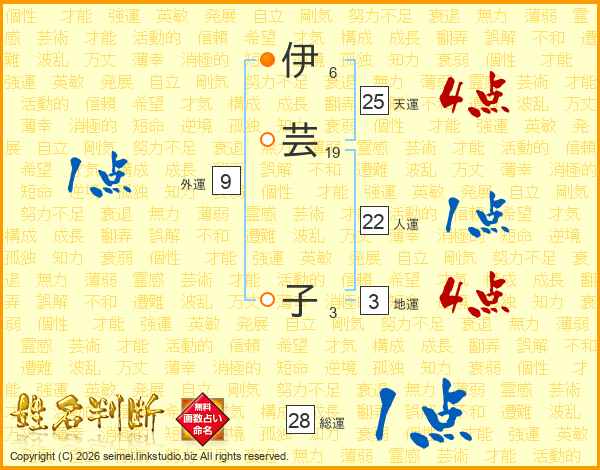 伊(6画)芸(19画) 子(3画)