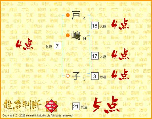 戸(4画)嶋(14画) 子(3画)