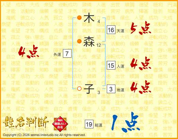 あなたの人生を表す1番重要な運勢です。生涯を通じて影響する総合運となり、主に50歳以降の晩年期に影響を及ぼします。苗字と名前の合計画数。