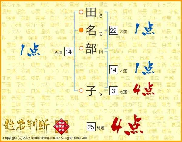 生活面を象徴する運勢です。外部から受ける影響力を表し、結婚運、家庭運や職場、環境への順応性を表します。総運から人運を引いた画数。姓や名が1文字の場合を除く。