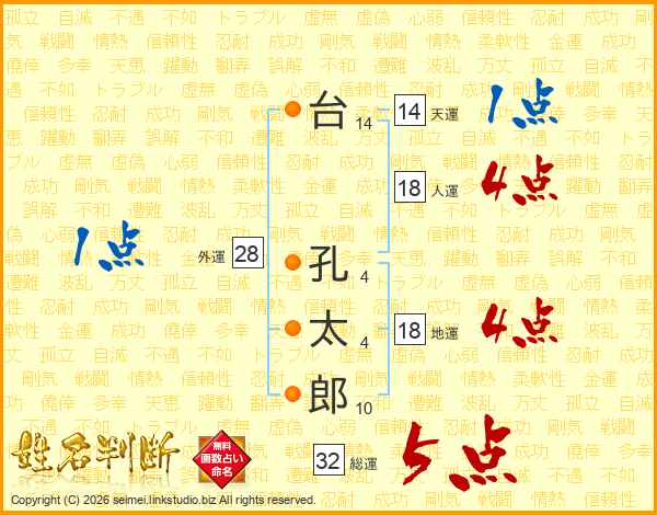 生活面を象徴する運勢です。外部から受ける影響力を表し、結婚運、家庭運や職場、環境への順応性を表します。総運から人運を引いた画数。姓や名が1文字の場合を除く。
