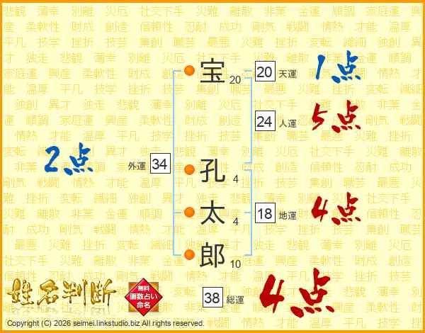 宝(20画) 孔(4画)太(4画)郎(10画)