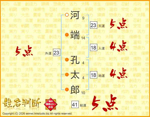 河端孔太郎さんの総運は41画の5点!