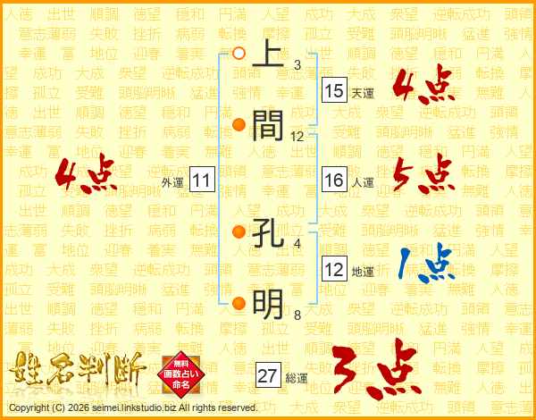 あなたの人生を表す1番重要な運勢です。生涯を通じて影響する総合運となり、主に50歳以降の晩年期に影響を及ぼします。苗字と名前の合計画数。