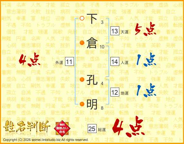 下倉孔明さんの人運は14画の1点!