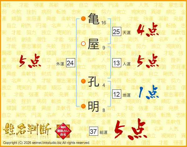 亀(16画)屋(9画) 孔(4画)明(8画)