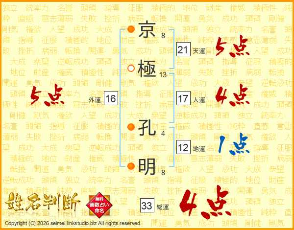 京(8画)極(13画) 孔(4画)明(8画)