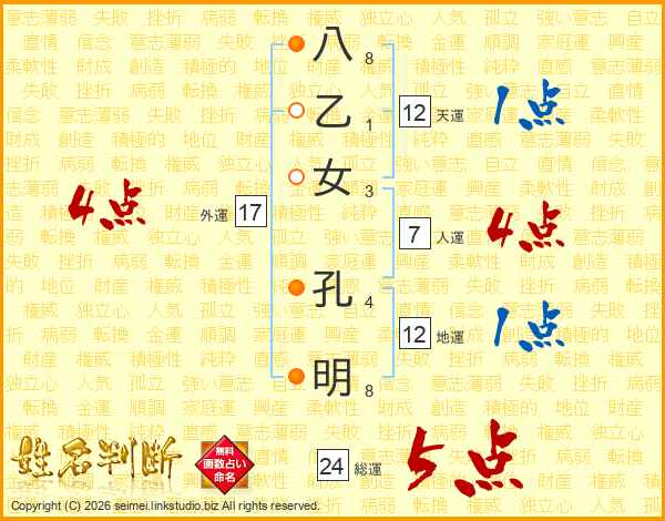 八(8画)乙(1画)女(3画) 孔(4画)明(8画)