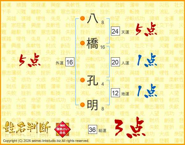 あなたの人生を表す1番重要な運勢です。生涯を通じて影響する総合運となり、主に50歳以降の晩年期に影響を及ぼします。苗字と名前の合計画数。