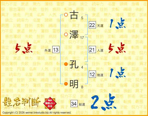 古(5画)澤(17画) 孔(4画)明(8画)