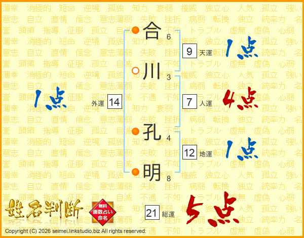 あなたの人生を表す1番重要な運勢です。生涯を通じて影響する総合運となり、主に50歳以降の晩年期に影響を及ぼします。苗字と名前の合計画数。