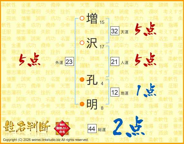 あなたの人生を表す1番重要な運勢です。生涯を通じて影響する総合運となり、主に50歳以降の晩年期に影響を及ぼします。苗字と名前の合計画数。