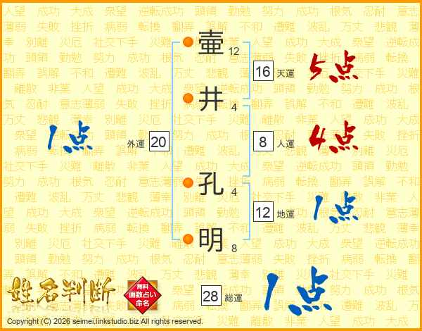 生活面を象徴する運勢です。外部から受ける影響力を表し、結婚運、家庭運や職場、環境への順応性を表します。総運から人運を引いた画数。姓や名が1文字の場合を除く。