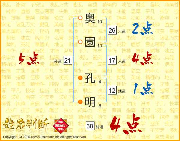 奥(13画)園(13画) 孔(4画)明(8画)