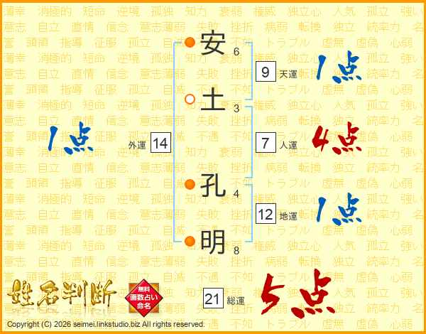 生活面を象徴する運勢です。外部から受ける影響力を表し、結婚運、家庭運や職場、環境への順応性を表します。総運から人運を引いた画数。姓や名が1文字の場合を除く。