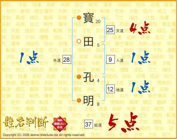 寳(20画)田(5画) 孔(4画)明(8画)