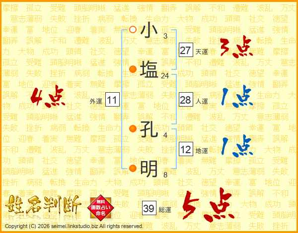 あなたの人生を表す1番重要な運勢です。生涯を通じて影響する総合運となり、主に50歳以降の晩年期に影響を及ぼします。苗字と名前の合計画数。