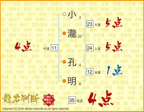 小(3画)瀧(20画) 孔(4画)明(8画)