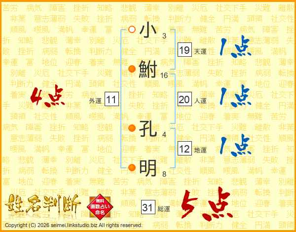 小(3画)鮒(16画) 孔(4画)明(8画)