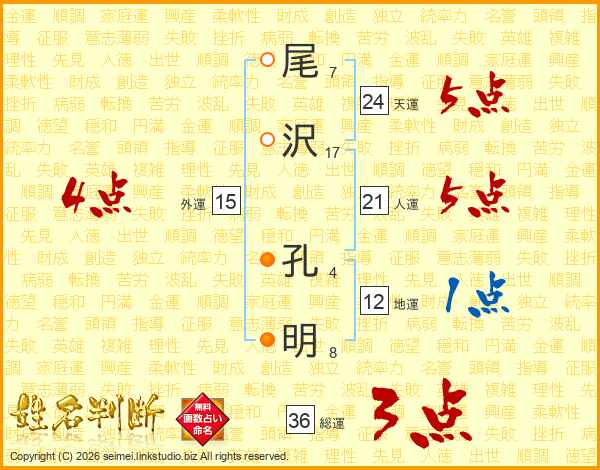 尾(7画)沢(17画) 孔(4画)明(8画)