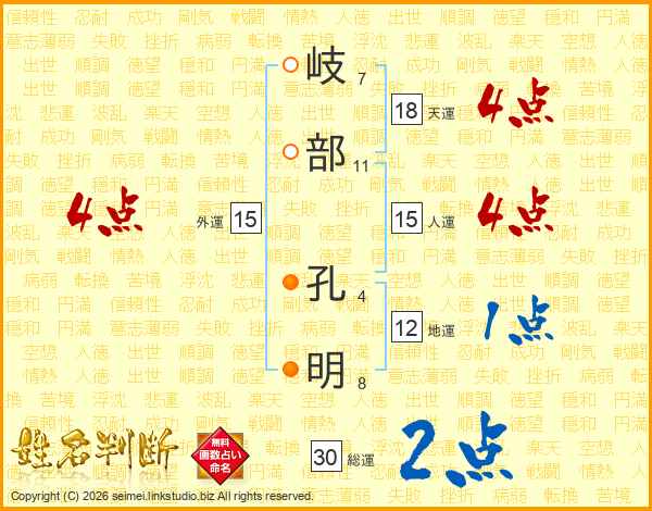 あなたの人生を表す1番重要な運勢です。生涯を通じて影響する総合運となり、主に50歳以降の晩年期に影響を及ぼします。苗字と名前の合計画数。