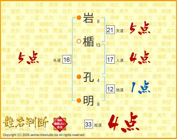 岩(8画)楯(13画) 孔(4画)明(8画)