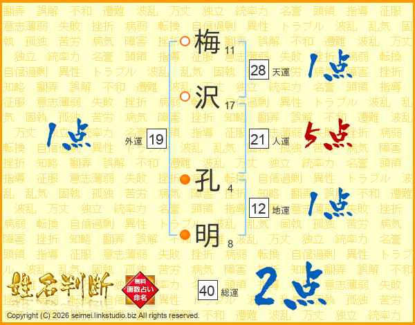 梅(11画)沢(17画) 孔(4画)明(8画)