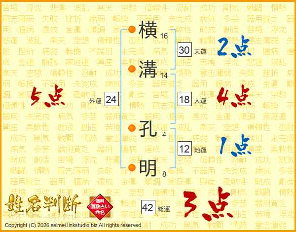 あなたの人生を表す1番重要な運勢です。生涯を通じて影響する総合運となり、主に50歳以降の晩年期に影響を及ぼします。苗字と名前の合計画数。