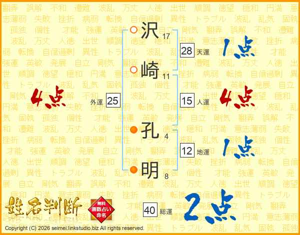 沢(17画)崎(11画) 孔(4画)明(8画)