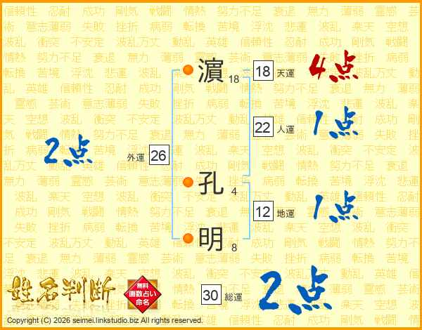 濵(18画) 孔(4画)明(8画)