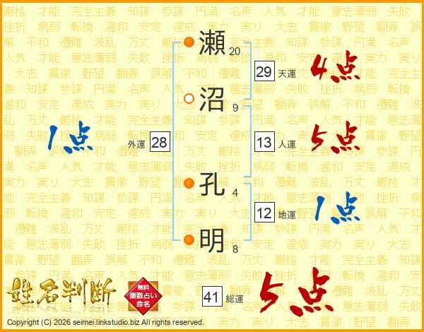 瀬沼孔明さんの総運は41画の5点!