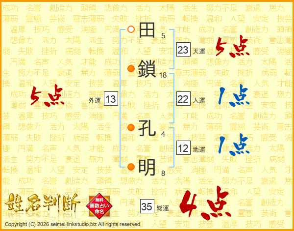 田(5画)鎖(18画) 孔(4画)明(8画)