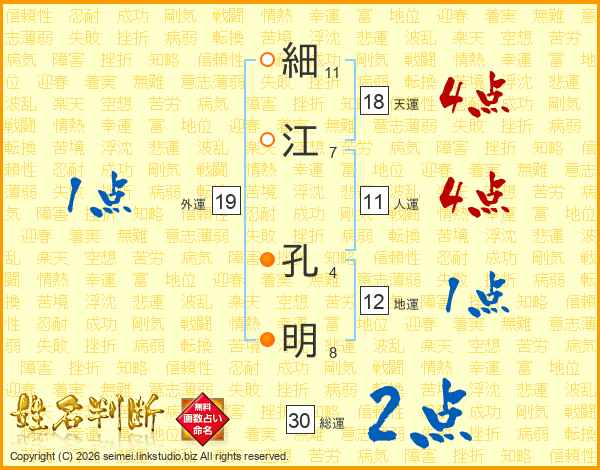 画数の奇数(○陽)と偶数(●陰)の配列で吉凶を占います。どちらかにかたよる名前は大凶名で避ける必要があります。画数の奇数偶数。