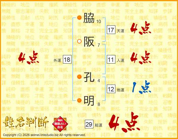脇(10画)阪(7画) 孔(4画)明(8画)