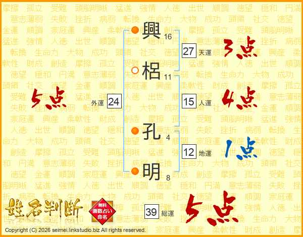 興(16画)梠(11画) 孔(4画)明(8画)