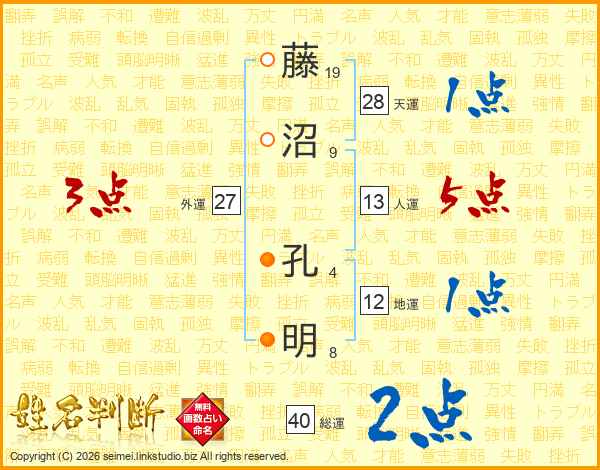藤(19画)沼(9画) 孔(4画)明(8画)