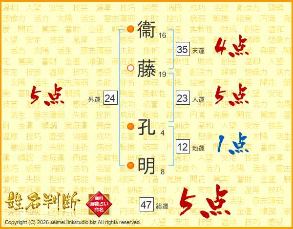 衞(16画)藤(19画) 孔(4画)明(8画)