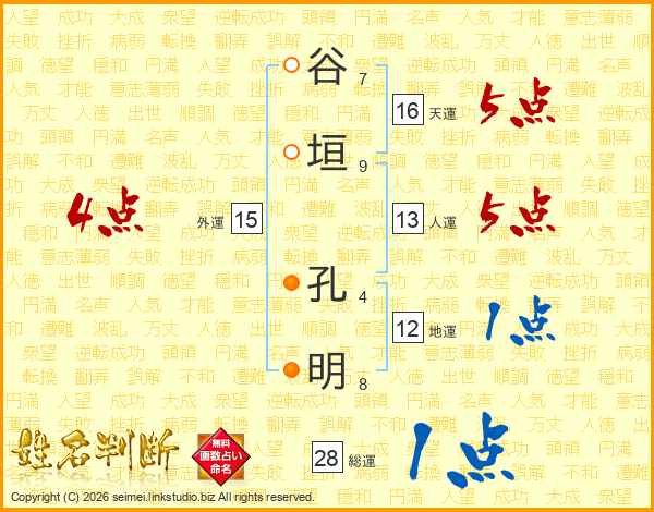 谷(7画)垣(9画) 孔(4画)明(8画)