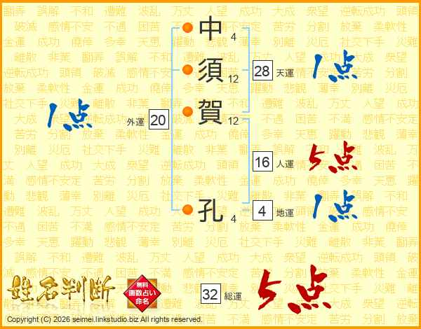 生活面を象徴する運勢です。外部から受ける影響力を表し、結婚運、家庭運や職場、環境への順応性を表します。総運から人運を引いた画数。姓や名が1文字の場合を除く。