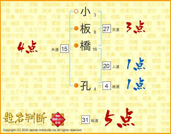 生活面を象徴する運勢です。外部から受ける影響力を表し、結婚運、家庭運や職場、環境への順応性を表します。総運から人運を引いた画数。姓や名が1文字の場合を除く。