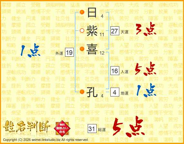 日(4画)紫(11画)喜(12画) 孔(4画)