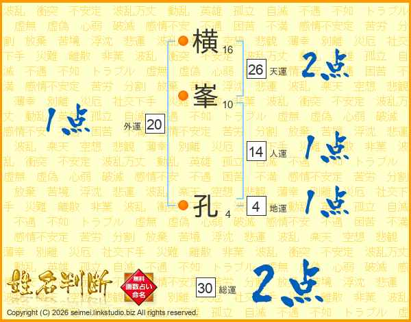 画数の奇数(○陽)と偶数(●陰)の配列で吉凶を占います。どちらかにかたよる名前は大凶名で避ける必要があります。画数の奇数偶数。