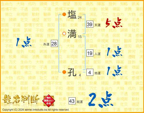 塩満孔さんの総運は43画の2点!