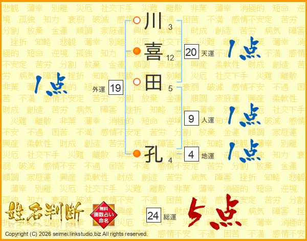 川喜田孔さんの総運は24画の5点!