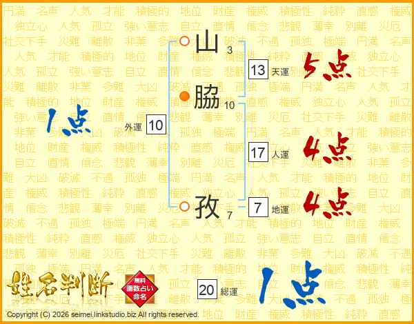 生活面を象徴する運勢です。外部から受ける影響力を表し、結婚運、家庭運や職場、環境への順応性を表します。総運から人運を引いた画数。姓や名が1文字の場合を除く。