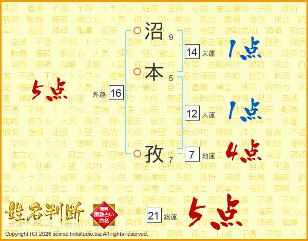 沼本孜さんの総運は21画の5点!